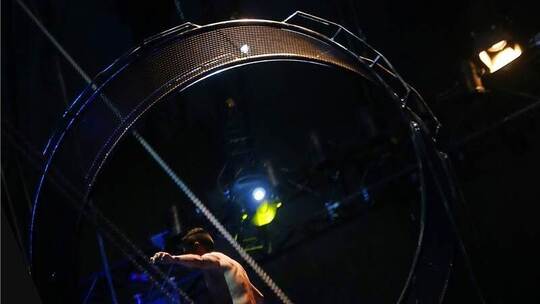 Die Kolumbianer haben ihre Nummer durch – alles muss jetzt schnell gehen. Bei einem hochprofessionellen Zirkus darf sich das Publikum zwischen zwei Nummern nicht langweilen. Am besten in Windeseile soll das schwere „Todesrad“ abgelassen, vom Haken, auf ein rollendes Gestell gehievt, hinausgefahren, die Luft aus dem Sicherheitskissen und die schlafe, aber dennoch schwere Hülle aus dem Manegen-Rund getragen werden.