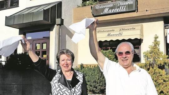 Keine weiße Fahne als Zeichen der Kapitulation, nur ein Winken zum Abschied: Die Gastronomen Monika und Pietro Marcelli gehen Ende des Jahres in den Ruhestand. Foto: Ketterl