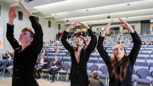 Den Auftakt des Wissenschaftsabends für jedermann gestalteten vier Tänzer vom Ballett des Pforzheimer Theaters mit Choreografien von Guido Markowitz und Damian Gmür. Zu abstrakten Klängen zuckten und verbogen sich die Körper der Tänzer im Audimax, dem großen Hörsaal der Hochschule. Danach begrüßte Professor Ulrich Jautz, Rektor der Hochschule Pforzheim, die ersten Zuhörer, darunter sowohl Studenten als auch Familien mit Kindern und Senioren.