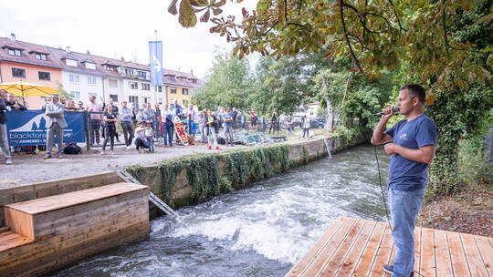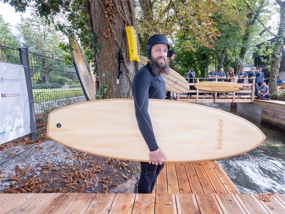 Pforzheim. Die Sonne scheint, aus den Boxen erklingt Surfmusik, und hier und da schlüpfen die Ersten in ihre Neoprenanzüge: Besser könnte der offizielle Start der Surfanlage an diesem Freitagnachmittag kaum sein. Beobachtet von Sponsoren und Pressevertretern auf der einen sowie Zaungästen auf der anderen Seite, springen Vereinsmitglieder unter Applaus wieder und wieder mit dem Surfbrett in den Metzelgraben.