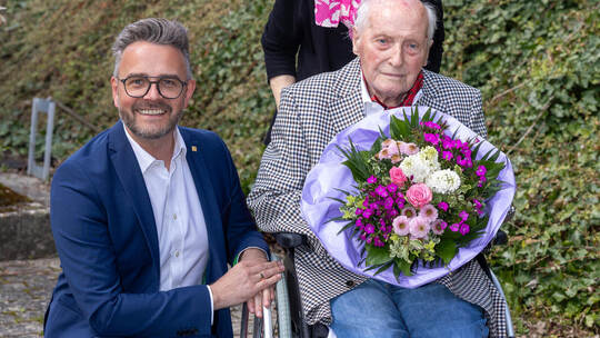 Im Haus Maihälden überbrachte ihm Oberbürgermeister Peter Boch deshalb Blumen, Ehrengaben – und natürlich die herzlichsten Glückwünsche des Ministerpräsidenten Winfried Kretschmann sowie der Stadtgesellschaft. Darüber freute sich der Jubilar gemeinsam mit seiner Tochter Anette Bonjour.