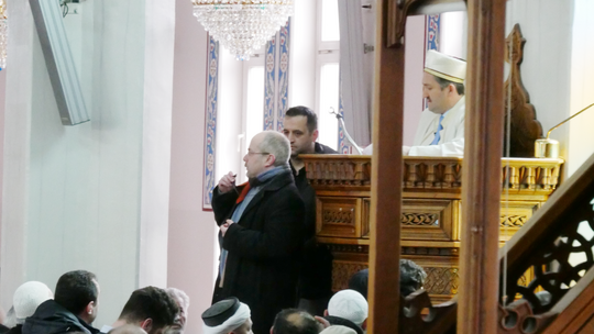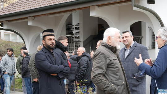 „Wenn die Moschee bedroht ist, sind alle Religionen bedroht.“ Das sind die Worte, mit denen der katholische Dekanatsreferent Tobias Gfell als Sprecher des Rats der Religionen zu Beginn des Freitagsgebets die Solidaritätsbekundung an die Muslime richtet. Sie stoßen auf Applaus der rund 500 Gottesdienst-Teilnehmer – eine ganz normale Anzahl, erläutert Yavuz Cevik – und den Dank des Imams. „Es macht uns stolz,, das wissen wir sehr zu schätzen“, sagt auch Cevik. „Bei dieser Zuwendung haben wir keine Bedenken“.