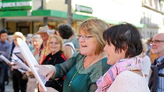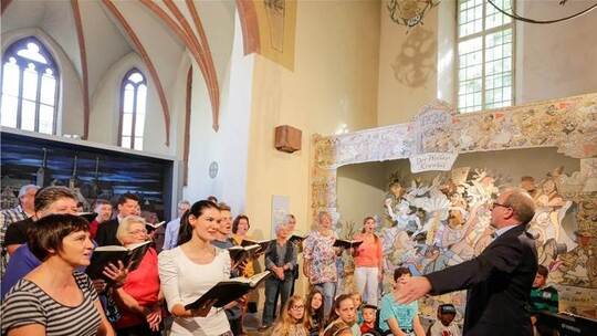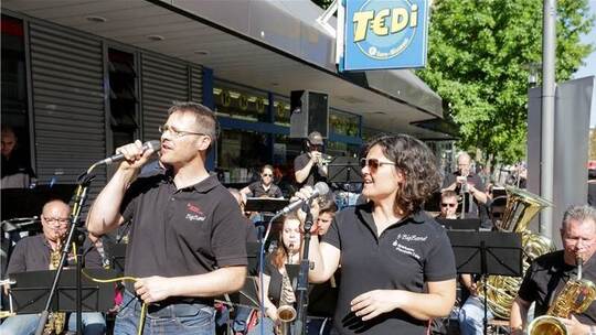 Wenige Schritte weiter hatte bereits die Sparkassen-Bigband Stellung bezogen. „Saturday in the Park“ von Chicago dichtete Sänger Roger Waigand kurzerhand in „Saturday in Brötzingen“ um. Ganz anders, aber ebenso locker die Stimmung in der Martinskirche. Dort leitete Jens Zimmermann den Chor der neuapostolischen Kirche zu ausdrucksstarken Melodien an, was die Sänger mit einem eindrucksvollen „Lobet den Herren“ unter Beweis stellten.