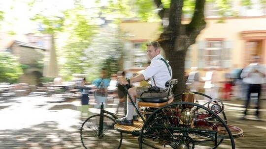 Wer einem leicht klingelnden und ratternden Geräusch folgte, konnte im Kastanienhof den Nachbau des ersten Autos von Carl Benz in Aktion entdecken. „Es steht sonst in der Garage des Stadtmuseums“, berichtete Klaus Haag vom Kulturamt, der bewundernde Zuschauer zu einer flotten Runde mit dem Fahrzeug einlud. Temperamentvoll auf etwas andere Art die spanische Musik vom Club de Amigos mit Flamenco-Tänzerin Alexandra Simón Rateike, die in Kombination mit der kräftigen Sonne Brötzingen an diesem Tag scheinbar in deutlich südlichere Gefilde rückten.