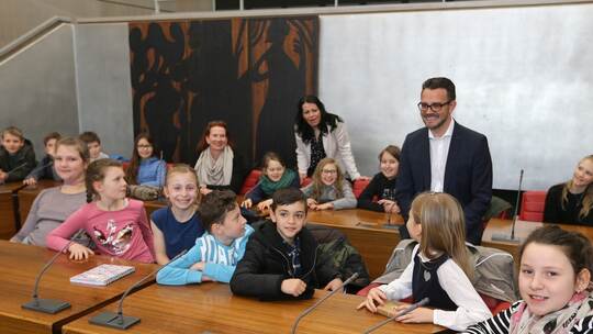 Und sie interessieren sich für sehr viel: Warum die Stadt zu wenige Kindergartenplätze hat, wann das Rathaus gebaut wurde, was nicht so schön am Beruf als Oberbürgermeister ist, warum Bäder geschlossen werden und ob Boch auch schon mal Fehler gemacht hat. „Ganz klar, das Wichtigste ist aber, daraus zu lernen, damit der Fehler nicht noch mal passiert“, sagt der OB. Zwar sei sein Tag immer voll mit Terminen, von morgens früh bis spät abends, und er müsse auch am Wochenende arbeiten. „Wie viel verdienen sie am Tag?“, fragen die Schüler und erfahren, dass Boch nach einer bestimmten Tabelle als Beamter 150.000 Euro im Jahr verdient. „Wie viel das am Tag ist, dürft ihr im Matheunterricht ausrechnen“, sagt er und gibt allen Autogramme.