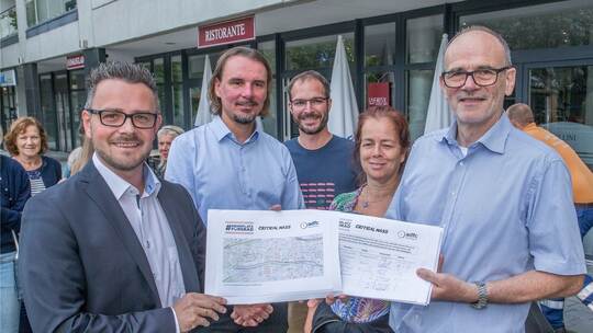 Das führt nur wenige Meter entfernt, in der Seniorenresidenz Ambiente, dazu, dass die Bewohner sich mit ihren Rollatoren kaum noch raus trauen. „Sie haben Angst“, erklärt Residenzleiter Fred Mahlmann. Auch er sei schon Opfer rasender Radfahrer geworden. Für die älteren Menschen, die ohnehin unsicher auf den Füßen seien, sei die Situation schlicht gefährlich und nicht tragbar. Ähnlich sehen das auch die Anwohner, darunter viele Senioren. Wie rund 300 andere haben sie deswegen in den vergangenen zwei Wochen die Petition von ADFC und Critical Mass für die Verlegung des Enztalradwegs unterschrieben, die Wolfgang Haas vom ADFC Kreisverband Pforzheim-Enzkreis am Donnerstagvormittag im Beisein seiner Mitstreiter an Boch übergab.