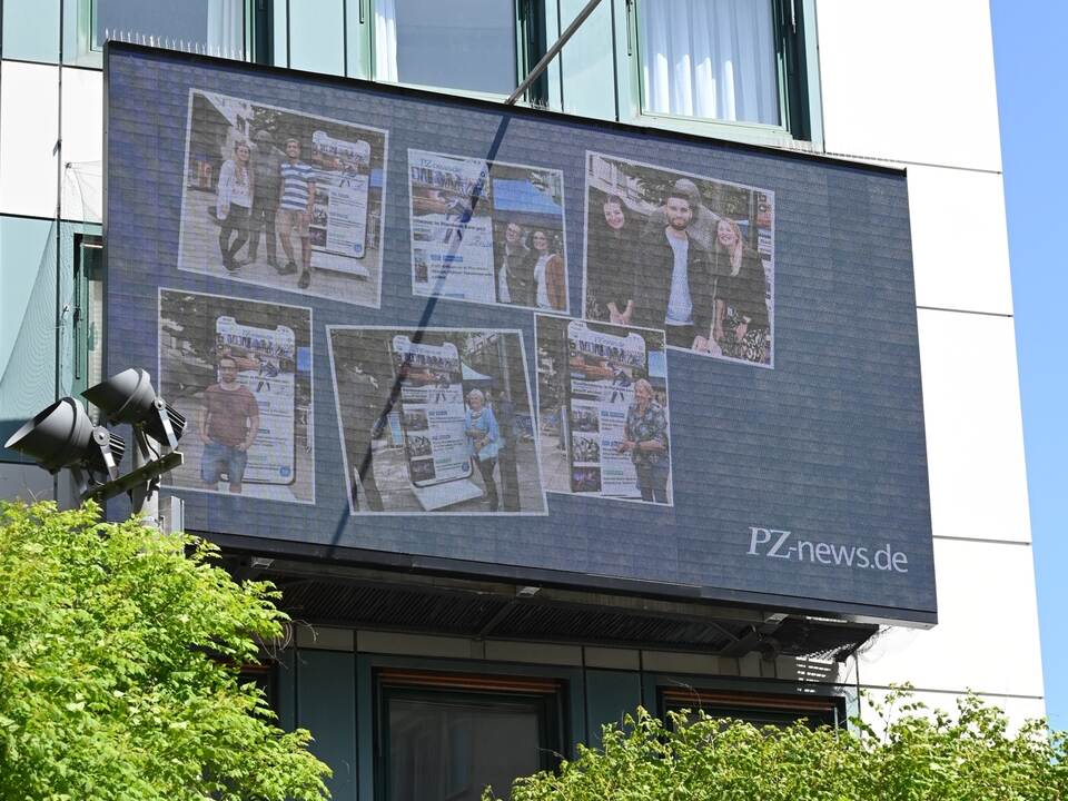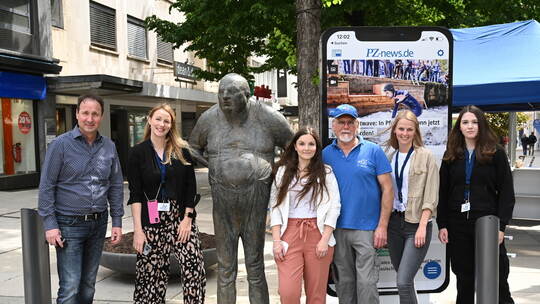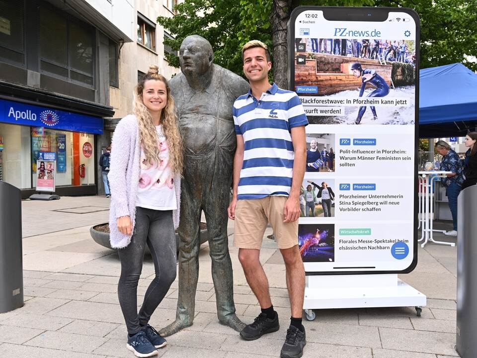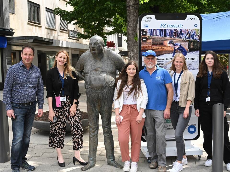 Pforzheim. Wie oft Fotograf Thomas Sommer an diesem Freitag auf den Auslöser gedrückt hat, kann er am späten Nachmittag schon gar nicht mehr sagen. Sorge, dass die Kapazität der Speicherkarten nicht ausreichen könnte, bestand bei ihm aber zu keiner Zeit. Zahlreiche Passantinnen und Passanten haben vor Sommers Kamera gemeinsam mit dem „Dicken“ vor der menschengroßen Handy-Attrappe am Eingang zur Fußgängerzone posiert. Die Fotos landeten dann unter anderem auf der PZ-Videowand am Leo.