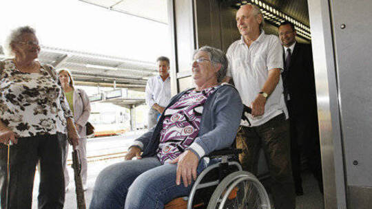 Hannelore Mauer (vorne) ist die erste Rollstuhlfahrerin, die einen der neuen Lifte ausprobierte. Bislang war ihr Bekannter Rudolf Feitenhansel (rechts ) auf die Hilfe von Bahnbediensteten angewiesen, um ihr über Gleise zu helfen. Ein unhaltbarer Zustand, wie auch OB Gert Hager (links) fand.