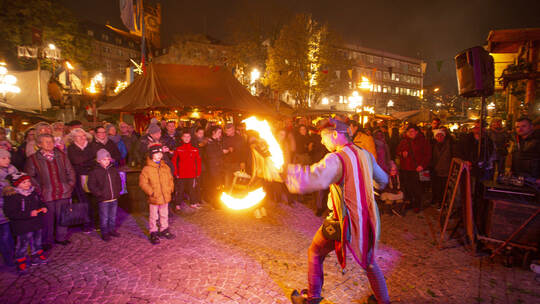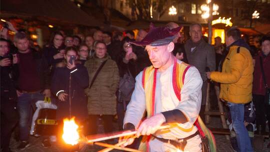 Pforzheim. Gaukler „Floxor“ lässt Feuerfackeln wirbeln, der Erste Bürgermeister Dirk Büscher schwärmt von einer „wunderbaren, heimeligen Atmosphäre“, und der singende CDU-Stadtrat Jörg Augenstein stimmt erstmals seinen brandneuen Weihnachtssong „Ein goldener Stern“ an: Eine stimmungsvolle und fröhliche Eröffnungsfeier erlebte Pforzheims Weihnachtszauber am Montagabend.