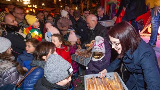 Ungewöhnlich viele Stadträte stehen bereit, um gratis 500 frisch gebackene Dambedeis zu verteilen. Jede helfende Hand kommt wie gerufen, denn die Menschentraube vor der Bühne des Mittelaltermarkts im Blumenhof ist riesengroß. Es sei schön, in all die strahlenden Kinderaugen zu blicken, sagt OB Peter Boch, der wie Sozialdezernent Frank Fillbrunn die Aktion tatkräftig unterstützt. Die vorweihnachtliche Stadt habe überregionale Strahlkraft, betont Boch, „und auch die Pforzheimer selbst genießen das hier sehr“.
