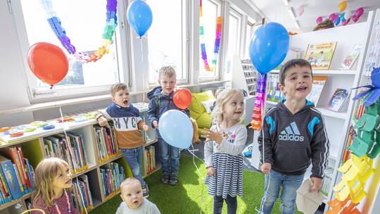 Die Familien nahmen den neuen Kinderbereich direkt in Beschlag. Wandtattoo, Sitzsäcke und Spielelemente laden hier zum Verweilen ein, auf die Erwachsenen wartet nebenan ein Sofa.
