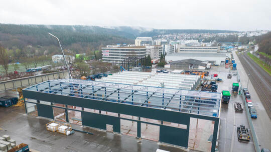 Es kommt anders: Eineinhalb Jahre später ragt ein neues Hallenskelett in die Höhe. Dort, wo noch beim vergangenen PZ-Besuch nichts als der Boden zu sehen war. Erste Fassadenelemente sind bereits angebracht, nun folgt die Dachkonstruktion. „Dann sieht das Ganze schon fast