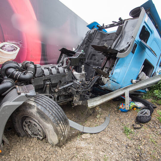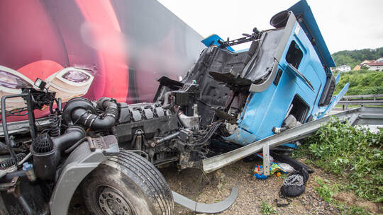Ein Sattelzug ist aus bislang ungeklärten Gründen ins Schlingern geraten, woraufhin der 54-jährige Fahrer die Kontrolle über das Fahrzeug verlor und nach links in die Leitplanke prallte. Dabei wurde er aus der Fahrerkabine geschleudert. Der Sattelzug rollte weiter, bis er schließlich die rechte Leitplanke durchbrach und zum Stehen kam. Der Fahrer zog sich dabei lebensgefährliche Verletzungen zu. An dem Schwerlastfahrzeug entstand ein Sachschaden von rund 50.000 Euro.