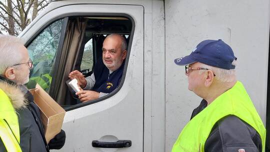 Viele Fahrer kamen aus Polen, aber auch aus der Ukraine, aus den baltischen Ländern, aus der Slowakei, aus Weißrussland und anderen osteuropäischen Ländern. Ein „Exot“ war ein brasilianischer Fahrer, der mit einem Lastzug aus der Slowakei unterwegs war. Weil Hans Adamietz und Georg Koziol Polnisch sprechen, war es möglich, sich mit einigen Fernfahrern auszutauschen. Sie berichteten, wie belastend es sei, so lange von der Familie getrennt zu sein. Einige waren schon seit zwei Wochen unterwegs und hatten noch weitere Touren quer durch Europa vor sich, so dass sie erst an Weihnachten wieder zu Hause sein werden. Stolz, aber auch ein bisschen wehmütig zeigte ein älterer Fahrer eines polnischen Kleinlasters ein Bild, das seine Enkelin für ihn gemalt hatte.