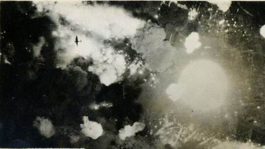 Eine „Lancaster“ beim Bombenhagel über Pforzheim, aufgenommen aus einer darüber fliegenden Maschine der Royal Air Force am Abend des 23. Februar 1945. Foto: Frei/PZ-Archiv