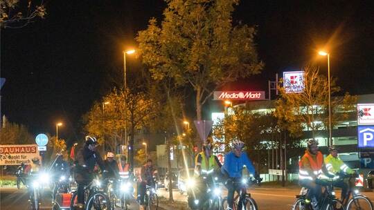 Ausgehend vom Treffpunkt Waisenhausplatz rollt der Tross nach einer kleinen Aufwärmrunde durch die Innenstadt schließlich die B 10 hinauf. Eine Blaulichteskorte begleitet die rund 60 Teilnehmer, die unter lautem Fahrradgeklingele, mit Guter-Laune-Musik, Rädern unterschiedlichster Ausstattungen und Signalwesten am Kaufland entlang eine Runde durch die Wilferdinger Höhe drehen. Der Ausflug endete nach knapp eineinhalb Stunden beim „Café Roland“, wo eine heiße Kürbissuppe auf dem Vorplatz auf die Gruppe wartete.