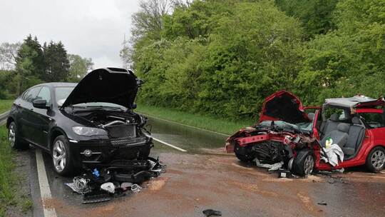 Durch den Aufprall wurde der VW-Führer in seinem Fahrzeug eingeklemmt. Er musste von der Feuerwehr befreit werden. Der Mann wurde mit einem Rettungshubschrauber in eine Klinik geflogen. Beide Fahrer und zwei 39- und 7-jährige Mitfahrer im BMW wurden durch den Unfall schwer verletzt. Der Schaden wird auf rund 30.000 Euro geschätzt. Die L562 war zur Unfallaufnahme bis gegen 17 Uhr voll gesperrt. Es bestand eine örtliche Umleitung.