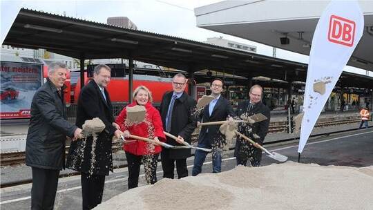 Pforzheim. Mit einem symbolischen Spatenstich durch Vertreter der Deutschen Bahn, Pforzheims Oberbürgermeister Gert Hager und die Bundestagsabgeordnete Katja Mast (SPD) hat gestern die weitere Modernisierung des Pforzheimer Hauptbahnhofs begonnen. Nachdem bereits im Jahr 2012 durch den Einbau dreier Aufzüge ein barrierefreier Zugang zu den Bahnsteigen geschaffen wurde, geht es nun darum, diese Bahnsteige an den Gleisen 1, 2/3, 4/5 und 103/104 neu zu bauen, so dass diese künftig 55 Zentimeter statt wie bisher 37 Zentimeter hoch sein werden. Dies erleichtere Reisenden mit eingeschränkter Mobilität, etwa in Rollstühlen oder mit Rollatoren, aber auch Eltern mit Kinderwagen oder Passagieren mit schwerem Gepäck das Einsteigen, teilt die Bahn in einer Presseerklärung mit. „Zusätzlich erhalten die Bahnsteige eine neue Beleuchtung und eine moderne Bahnsteig-Ausstattung“, heißt es darin weiter. Ergänzend werde der von der Bahn als mittlere Unterführung bezeichnete Zugang aus der Bahnhofshalle zu den Gleisen, von dem auch die Lifte abgehen, optisch aufgewertet