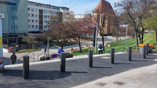 Teil des Sicherheitskonzepts der Stadt Pforzheim sind sieben neue Poller oberhalb der großen Treppe am Blumenhof, die dort fest im Boden verankert wurden.