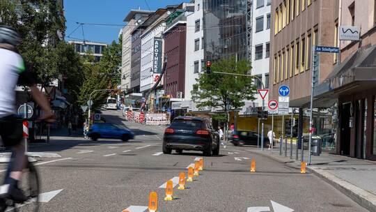 Doch damit ist Schluss. Die Stadt hat dort 19 flexible Gummipoller in den Asphalt geschraubt. Was aussieht wie kleine, orangefarbene Lappen, ist Teil einer neuen Linie gegen