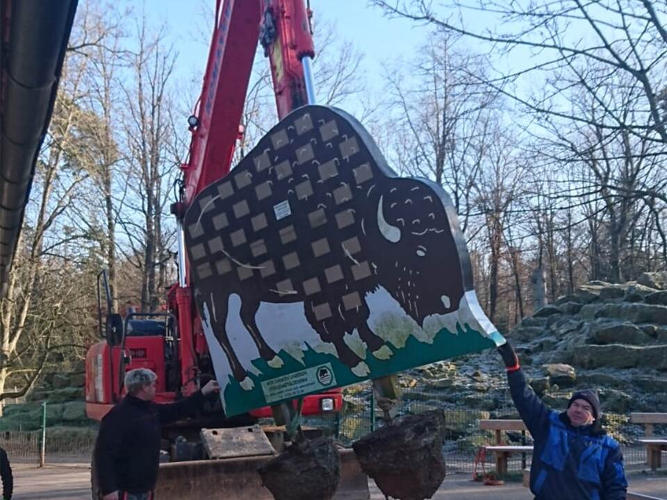 Der Förderverein will mit diesem tierisch kunstvollen Hingucker – so viel hatte der Vorsitzende Jan Lauer bereits jüngst im PZ-Gespräch verraten – jene würdigen, die Herz zeigen für den überregional beliebten Park und dessen Bewohner. Der in die Jahre gekommene Kunststoff-Wisent mit den weißen Täfelchen auf dem Leib, auf dem bislang die Namen von Sponsoren zu lesen waren, wurde abgebaut und mit schwerem Gerät weggehievt. Der neue Koloss war da bereits auf dem eigens geschaffenen Fundament nahe dem Ottergehege in Position gebracht. Demnächst soll es einen Termin zur feierlichen Enthüllung und Einweihung des mysteriösen Neulings geben. Bis dahin dürfte auch die aktuell laufende Sanierung der Otterbrücke fertig sein.