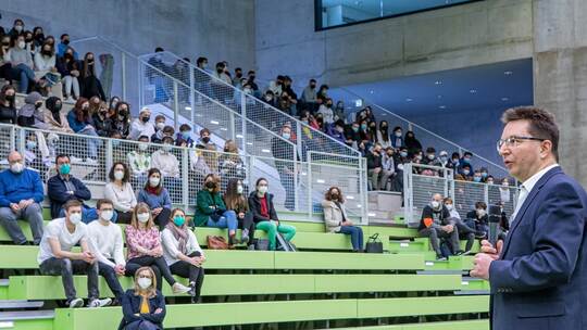 Die Schüler konnten dafür verschiedene Stationen besuchen. Bei Filmen über den Holocaust, Judenhass sowie durch eigene Recherche zu Stolpersteinen oder der Woche der Brüderlichkeit wurde vorhandenes Wissen vertieft und neues hinzugewonnen: „Es hat mich überrascht, zu sehen, dass Synagogen extra dicke Türen und Sicherheitssysteme haben. Ich würde mich total paranoid fühlen“, erzählte der 16-jährige Darius Poth. Sein Mitschüler Philipp Jung fügte hinzu: „Es fühlt sich schlecht an zu wissen, dass jüdische Menschen immer noch so schlimm behandelt werden.“ Wie seine Freunde aus der 10c war auch Kevin Brauer überrascht, dass Antisemitismus in der Gesellschaft noch so stark vertreten ist. Der Landesbeauftragte gegen Antisemitismus, Michael Blume, sprach im Anschluss in der Bertha-Benz-Halle über die Geschichte des Judentums, Rassismus, verschiedene Kulturen und Bräuche. Am Vorabend wurde ihm eine Kippa geschenkt, die Schüler reichten die Kopfbedeckung vorsichtig herum und schauten sie sich genau an. Sich zu bilden und Berührungsängste zu verlieren sei sehr wichtig, so Blume. Dabei ginge es nicht um Schuld für Dinge, die in der Vergangenheit passierten. Sondern um die Zukunft und um die Art von Gesellschaft, in der man leben möchte: Eine offene, vielfältige Gesellschaft, in der man sein kann, wie man möchte, oder eine Gesellschaft voller Vorurteile und Hass.