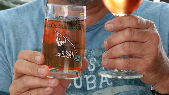 „Gut ist’s geworden“, lobt Ulmer den Transfer seines Werks von Papier auf Glas. „Ein tolles Design“, schwärmt „Oechsle-Brunnen“-Wirt Siegfried Weiß: „Wir haben immer großartige Künstler.“ Die Oechsle-Gläser – zu kaufen für einen beziehungsweise zwei Euro – sind beliebte Souvenirs.