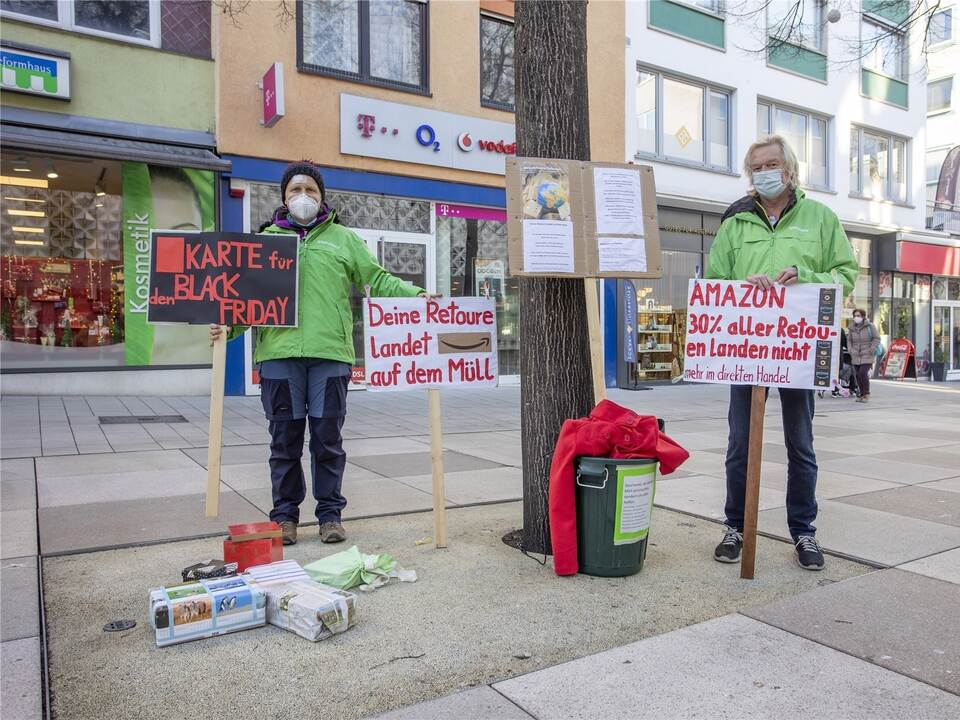 Unter dem Motto „Green Friday“ lautete deren Appell: „Kaufe nur das, was du auch wirklich brauchst, und lasse dich nicht zu unnötigen Käufen verlocken.“ Die Demonstranten – coronabedingt nur zu zweit vor Ort – machten Passanten mit Schildern etwa darauf aufmerksam, dass viele Retouren im Onlinehandel nach wie vor auf dem Müll landeten.
