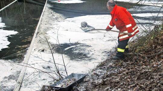 PFORZHEIM. Wenige Tropfen Motoren- oder Heizöl genügen eigentlich schon, um große Mengen Trinkwasser zu verseuchen, aber in Pforzheim-Dillweißenstein ist es gleich eine größere Menge Öl gewesen, die in die Nagold geflossen ist. Bei Abbrucharbeiten an einem Haus an der Baldung-Grien-Straße kam es zu diesem Ölunfall, der die Pforzheimer Berufsfeuerwehr und die Freiwillige Feuerwehr Dillweißenstein mit fünf Fahrzeugen und 16 Mann dazu Spezialisten vom Eigenbetrieb Stadtentwässerung Pforzheim ESP und einer Privatfirma rund dreieinhalb Stunden lang beschäftigte.