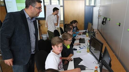 Während das Smartphone für viele nur ein Mittel zum Zweck – Telefonieren oder Simsen – ist, interessieren sich andere für die Abläufe hinter dem Display. Bei dem Workshop erfuhren die computerbegeisterten Schüler, unter ihnen auch viele Mädchen, wie sie selbst kleine Spiele entwickeln können. In kleinen Gruppen erstellten die Schüler unter Anleitung der Studenten Beate Merk und Georgios Martikas ihre ersten eigenen Apps. Und das in gerade einmal zweieinhalb Stunden. „Das Tolle am Programmieren ist, dass man keine Angst haben muss, etwas falsch zu machen. Es gibt immer mehrere Lösungen, und man kann alles so oft ausprobieren, wie man möchte“, sagt Professor Raphael Volz. Es sei gar nicht so schwer, eine App zu programmieren. „Wichtig sind Interesse am Thema und logisches Denkvermögen.“ Dies bewiesen die 13 Schüler bei der App-Entwicklung mit dem Programm „MIT App Inventor“. Sie programmierten das Spiel „Goal“, bei dem es um das Elfmeter-Schießen geht. Wer schnell genug die richtigen Befehle herausfand, entwickelte danach die App „Moortiere“. Mit dem Labyrinth-Spiel „Maze-Runner“ erklärte Volz den Schülern die Grundbegriffe des Programmierens: Befehle, Schleifen und Bedingungen, die den Rechner dazu bringen, zu tun, was der Programmierer möchte.