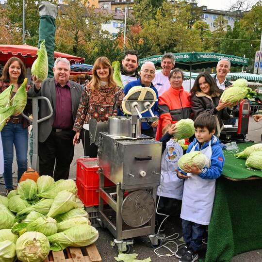 Bereits zum 14. Herbstfest lädt der Marktbeschicker Jörg „Jo“ Müller in Kooperation mit verschiedenen Partnern und Vereinen für die PZ-Hilfsaktion „Menschen in Not“ ein - ein Pendant dazu findet im Frühjahr statt. Die Krautwickel werden von zahlreichen Kuchen ergänzt, die neben der Gesellschaft auch von den Marktfrauen gebacken wurden.