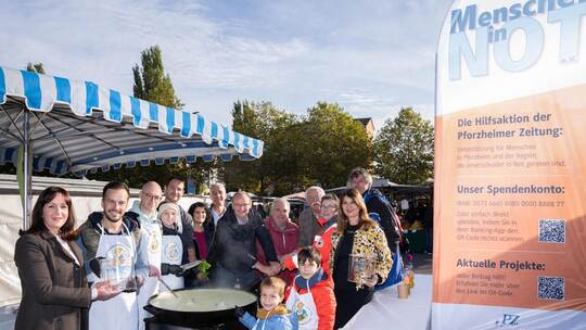 Parallel dazu schnippeln CDU-Politiker und Rechtsanwalt Philippe A. Singer, Eisingens Bürgermeister Sascha-Felipe Hottinger und Kämpfelbachs Bürgermeister Thomas Maag konzentriert Champignons und Zwiebeln, die kurz darauf in einer riesigen Pfanne von Hottingers Söhnen Matteo und Emilio miteinander vermengt werden. Einige Meter weiter werden 60 frische Forellen von dem Stadtrat der Freien-Wähler-Vereinigung Hans-Joachim Haegele und dem Pforzheimer Angelsportverein an die Marktgänger angeboten, den besonderen Geschmack verleiht ihnen dabei der Buchenrauch, betont Haegele, der die eingenommene Spendensumme am Ende des Markttages auf 500 Euro aufrundet.