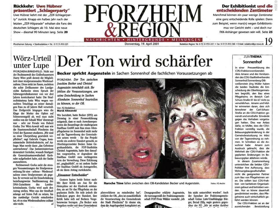 Aber mehr als unsichtbare Zorneswölkchen über seinem Kopf sind selbst dann nicht zu erahnen. Das hat wohl im Sinne eines oberbürgermeisterlichen Joberhalts Vorteile: Die Pforzheimer goutierten Beckers Einschätzung zu Christel Augenstein vor einem Vierteljahrhundert mehrheitlich nicht – einen Monat später wählten sie die Liberale statt seiner zur Rathaus-Chefin. Die erste von drei Wahlniederlagen amtierender Pforzheimer Oberbürgermeister in Folge. Eine Zäsur – und für die Stadt der Übergang vom 20. zum 21. Jahrhundert.