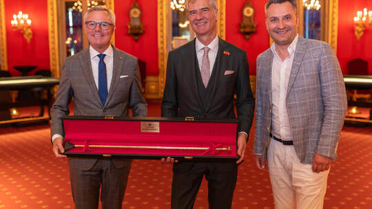 Pforzheim. Noch bevor am Sonntag, 31. August, beim Patronatstag des Casinos Baden-Baden auf der Galopprennbahn Iffezheim das traditionsreiche Rennen um die „Goldene Peitsche“ gestartet wird, hat die ikonische Trophäe bereits ihren ersten großen Auftritt erlebt: Sie wurde im Casino Baden-Baden von Stephan Buchner (Geschäftsführer Baden Galopp) feierlich an Tobias Wald (Geschäftsführer der Baden-Württembergischen Spielbanken GmbH & Co. KG) in Anwesenheit von Daniel Gerber (Niederlassungsleiter Baden-Baden, Juwelier Leicht) übergeben.