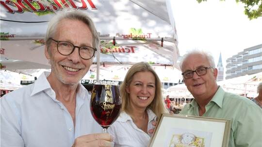 Pforzheim. Seine Kunst ist dieser Tage in – oder besser: an aller Munde. Der Pforzheimer Schmuckdesigner Piet van den Boom persönlich hat am Montag das mit seinem Motiv gestaltete Glas zur 32. Auflage des OechsleFests vor dem Weinbrunnen auf dem Marktplatz signiert.