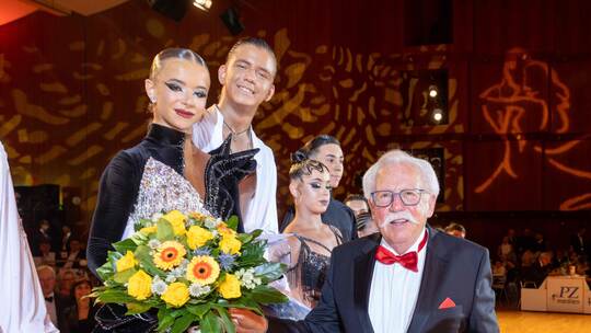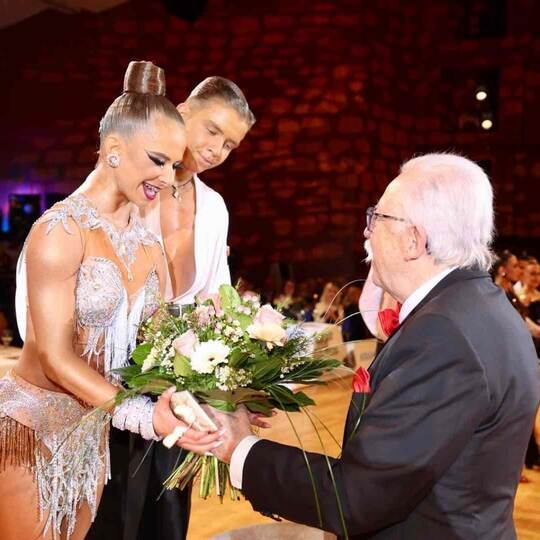 Neben dem von Kurt Tassotti entworfenen Pokal durften sich Ivan Smekalkin und Yeva Liermontova noch über eine weitere Auszeichnung freuen. Sie wurden von PZ-Verleger Albert Esslinger-Kiefer als bestes Pforzheimer Nachwuchspaar geehrt.