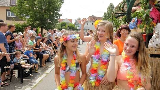 Voller Ideen war am Sonntagnachmittag der große Festumzug. Vereine, Kindergärten und Bewohner verschiedener Straßenzüge hatten sich viel einfallen lassen. „Der Arlinger, unser Paradies“, lautete das Motto der „Arlinger Clique“, die im paradiesisch dekorierten Wagen mit Hawaii-Hemden und Hula-Röcken auftrat und Äpfel verteilte. Mit Blumenhüten und in bodenlosen Blumentöpfen steckend, stellte die Fußgruppe aus der Hohlohstraße mit Freunden echte „Arlinger Gewächse“ dar. Ein besonderer Hingucker war der Wagen der Baugenossenschaft Arlinger mit Blumenkönigin Svenja Rittmann. „Sechs Wochen Bauzeit und über 25 000 Papierrosen“, verriet Stadtrat Jörg Augenstein, der den Umzug moderierte. Auch der künftige Oberbürgermeister Peter Boch, der in Begleitung seiner Frau Monika und Sohn Vincent den Festumzug anschaute, hatte seinen Spaß.