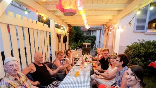 Wimpelgirlanden entlang der Gärten säumten nicht nur die Hauptverkehrsstraßen. In den Gärten waren fantasievolle Dekorationen zu entdecken, so dass die Besucher bei ihrem Spaziergang entlang der gesperrten Straßen in Richtung Festplatz viel zu sehen bekamen – Papierblumen, die aus Hecken wuchsen, riesige Plüschtiere, ein Piratenschiff, einige Märchen- und Filmfiguren und noch viel mehr. In Gärten, auf Balkonen, Terrassen, Garageneinfahrten oder einfach vor der Haustür kamen Menschen zusammen, um zu feiern. „Die Gemeinschaft und den Zusammenhalt kann man sehen“, sagte Sven Rittmann, stellvertretender Vorsitzender der Arlinger Gartenstadtgemeinschaft. „Das ist wie ein Lauffeuer, einer zündet das Feuer an, und bald brennt es lichterloh, symbolisch natürlich.“ Der warme Sommerabend bot den passenden Rahmen. Jörg Odenwald und seinen Gästen war es in der Feldbergstraße so warm, dass sie den Ventilator mit auf die Straße stellten. „Einfach die Tür aufmachen, und jeder, der reinkommt, kann sich etwas nehmen, so ist das hier im Arlinger“, erklärte Odenwald.