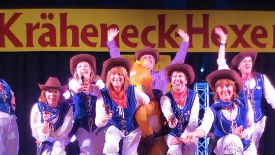 Als erste Gruppe begrüßten die „Bü-Hoi-Cravallos“ aus Büchenbronn in blauen Kostümen, mit Trompeten und Trommeln sowie Liedern wie „Irgendwie, irgendwo, irgendwann“, im Original von Nena, das Publikum. Auch die Marketenderinnen der Belrem-Gilde aus Dillweißenstein tanzten mit dem Publikum durch den Abend. Die Pforzheimer Faschingsgesellschaft verzauberte durch ihre Pirouetten, bunten Kostüme und bunten, langen Haare, inklusive einer Mischung aus Hexen-, Garde- und Schautanz, das Publikum. Moderator Fabian Häffelin betonte das Engagement der Kräheneck-Hexen. So finde traditionell auch eine Prunksitzung für Menschen mit Behinderung statt, um eben diese zu fördern.