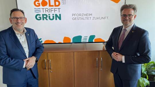 Pforzheim. Pforzheim. Bis jetzt sieht es so aus, als ob die Saat aufgeht. Jedenfalls ist der Boden dafür vorbereitet, und so äußert sich nicht nur Stadtoberhaupt Peter Boch voller Zuversicht; Optimismus geht auch von Bürgermeister Tobias Volle aus. Beide präsentieren sich zum Thema Landesgartenschau (LGS) in Pforzheim mit frohen Gesichtern unter dem Motto „Gold trifft Grün“, das nun die Bemühungen um dieses Format begleiten wird.