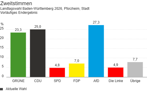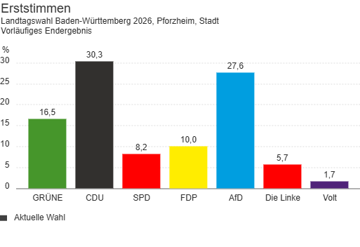 Pforzheim. Bei der Landtagswahl in der Stadt Pforzheim liegt bei den Erststimmen der CDU-Kandidat Andreas Renner vorne. Er erhält 12.234 Stimmen (30,3 Prozent). Dahinter folgt Alexsei Zimmer (AfD) mit 11.146 Stimmen (27,6 Prozent). Simon Schwarz (Grüne) kommt auf 6.683 Stimmen (16,5 Prozent).