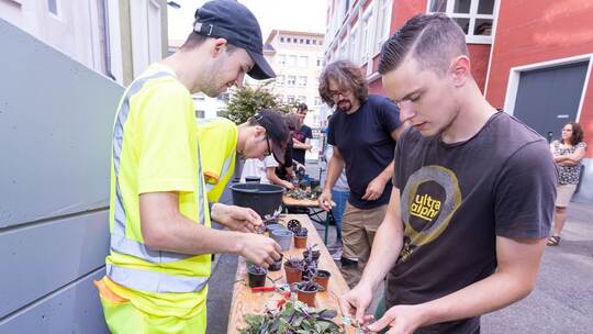 Pforzheim. Bei der Arbeit kommt der angehende Gartenbaufachwerker Paul Netzer öfter mal ins Gespräch. „Viele haben Fragen“, erzählt der 21-Jährige im RoWi-Quartier an der Pforzheimer Bleichstraße, während er mit Maximilian Glatt und Andre Schwaab im Hof Salbeistecklinge vorbereitet. Hier findet im Rahmen des städtischen Projekts „Gestalte dein Quartier“ an diesem Montagnachmittag erstmals die Lange Werkbank statt. Die soll es nun einen Monat lang geben.