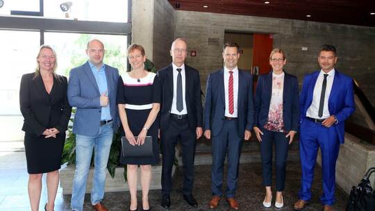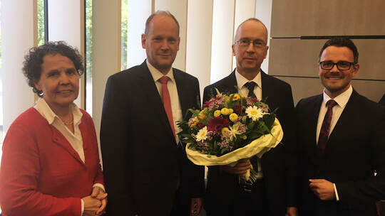 Baubürgermeisterin Sibylle Schüssler, Erster Bürgermeister Dirk Büscher (von links) und Oberbürgermeister Peter Boch (rechts) gratulieren dem neu gewählten Sozialbürgermeister Frank Fillbrunn.