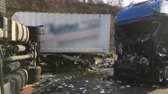 Laut Polizei war ein 59 Jahre alter deutscher Lkw-Fahrer gegen 10.40 Uhr aus bisher ungeklärter Ursache Höhe Wurmberg an einem Stauende auf einen weiteren Lkw aufgefahren. Durch die Wucht des Aufpralls kippte das Zugfahrzeug des vorderen Lkw-Gespanns auf die Seite, wobei sich der betreffende Lkw-Fahrer selbst aus dem Wrack befreien konnte. Er wurde zur weiteren Behandlung in ein Krankenhaus transportiert.