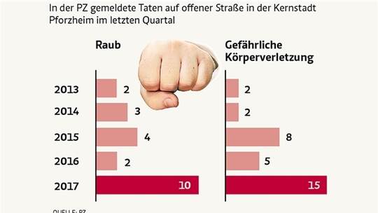 Pforzheim. Die Polizei sagt mit Blick auf ihre Statistik, Pforzheim sei nicht unsicherer geworden und die Kriminalität gehe zurück. Das pure Zählen der Polizeimeldungen seit 2013 aber ergibt deutlich mehr Fälle von Raub und Gewalt auf offener Straße in Pforzheim. Die Zahlen beziehen sich aufs jeweils letzte Quartal eines Jahres.