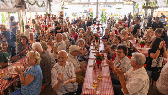 Pforzheim. Die Fahrzeugsperren am Eingang zur Pforzemer Mess zu überwinden, stellt kein Problem dar. Rollstühle und Rolllatoren passieren diese Sicherheitsmaßnahme ohne Probleme. Nur vor dem Festzelt „Stephans Platzerl & Wilde Jause“ gibt es kurzfristig einen Stau. Alle der 120 angemeldeten Seniorinnen und Senioren wollen rein; viele von ihnen mit besagten Hilfen zur Mobilisierung. Deshalb sind im Innern des Zelts auch viele Bierbänke auf die Seite geräumt worden, damit die Rollstuhlfahrer am Montag bequem an den Mittagstisch gelangen können.