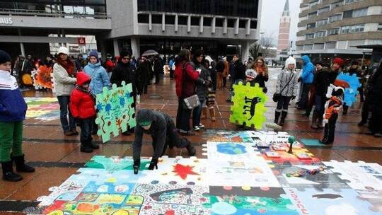 Pforzheim. Trotz klirrender Kälte haben am Samstagvormittag zahlreiche Bürger die Entstehung eines eindrucksvollen Zeichens gegen Krieg und Gewalt und für Zivilcourage und Toleranz mitverfolgt: Insgesamt 400 Puzzleteile umfasst das Mosaik, das bis zum 1. März auf dem Marktplatz zu bestaunen ist. Es erinnert an die Zerstörung großer Teile Pforzheims am 23. Februar 1945 durch die Bombardierung der Alliierten und mahnt, dass so etwas nie wieder passieren darf.