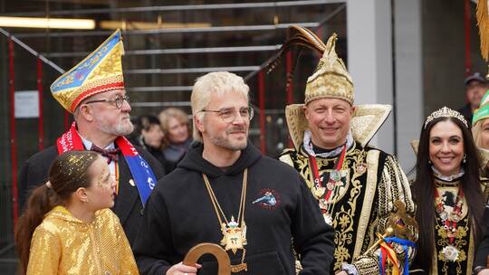 Pforzheim. Dass er sich eine Perücke aufgesetzt und seinen Anzug gegen einen Kapuzenpullover getauscht hat, dass sein dunkles Haar blond und sein Aussehen leger geworden ist, hilft ihm nichts: Die Narren kann Peter Boch damit nicht täuschen. Sie haben den Pforzheimer Oberbürgermeister sofort erkannt und vor dem Rathaus in Empfang genommen.