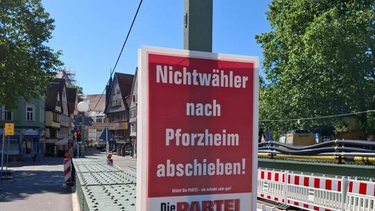 Pforzheim/Stuttgart. „Die Partei“ in Stuttgart macht gerade mit ihren Wahlplakaten auf sich aufmerksam, die nicht jedem Pforzheimer gefallen werden. Besonders im Netz. "Nichtwähler nach Pforzheim abschieben!" steht dort in großen, weißen Buchstaben geschrieben. Aber was will uns die Partei damit sagen?
