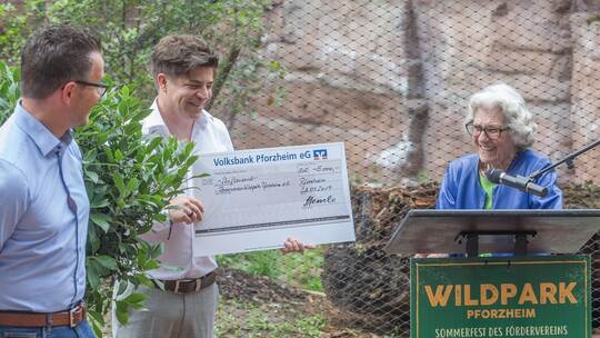 Waltraud Steinle, die Ehefrau von Wildpark-Freundeskreis-Gründer Ewald Steinle, freut sich bei der Einweihung gleich ein neues Projekt anzustoßen: Ihre Spende in Höhe von 5000 Euro soll für die Neugestaltung des Eingangsbereichs genutzt werden. „Damit das Pforzheimer Aushängeschild noch mehr Lust auf das Natur- und Tiererlebnis macht.“